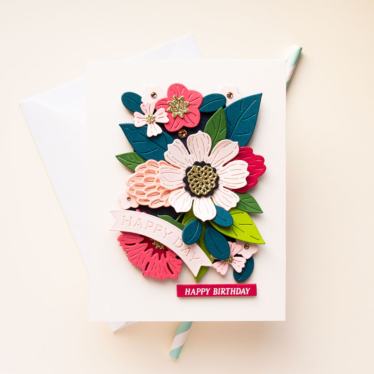 The floral die set from day five inspired me to step outside my comfort zone with a bold, primary color palette. By mixing different white cardstock textures and adding subtle dimension, this card shows how color choices alone can completely change the mood of a design.