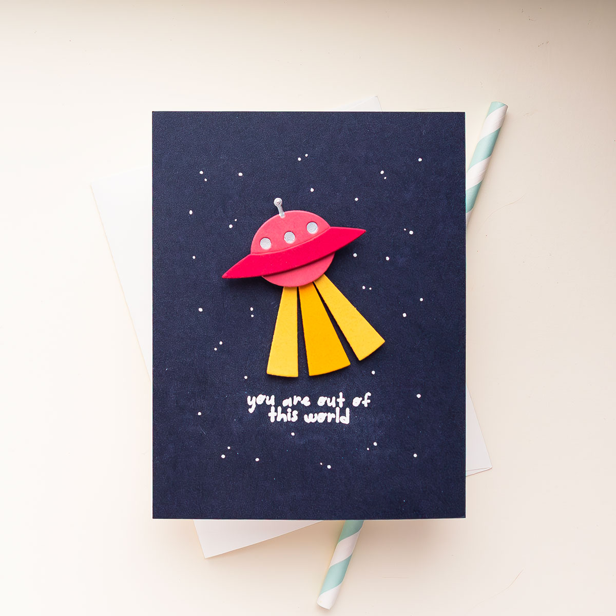 The tiny UFO die from day twenty was whimsical and impossible not to love. I combined it with the You’re Out of This World sentiment for a clean, playful card featuring bold pinks, yellows, and a deep indigo background. Simple white heat embossing and hand-drawn star details completed this fun, kid-friendly design.