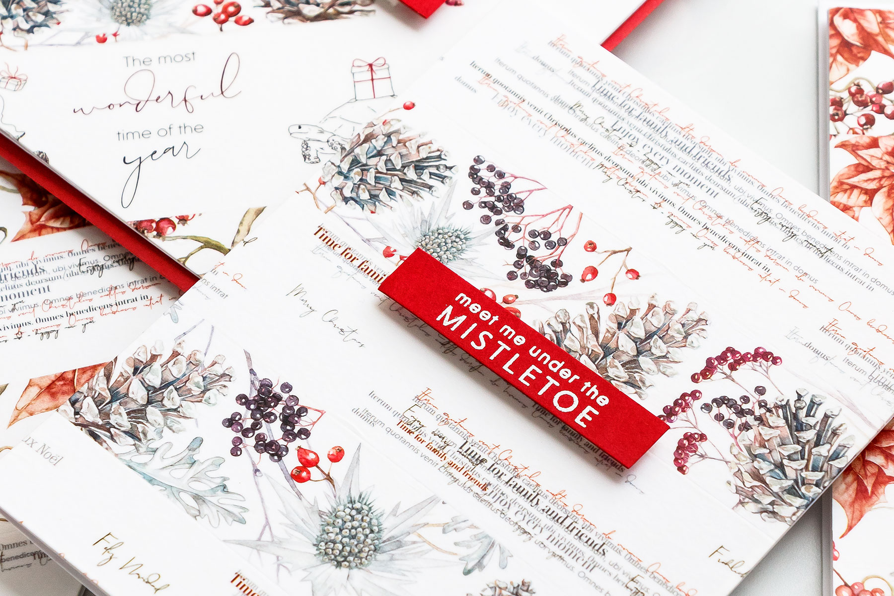 To add sentiments to these Christmas cards I white heat embossed various messages from the Meet Me Under the Mistletoe, Favorite Season and Merry and Bright stamp sets onto red cardstock, trimmed into rectangles and foam mounted onto my cards.