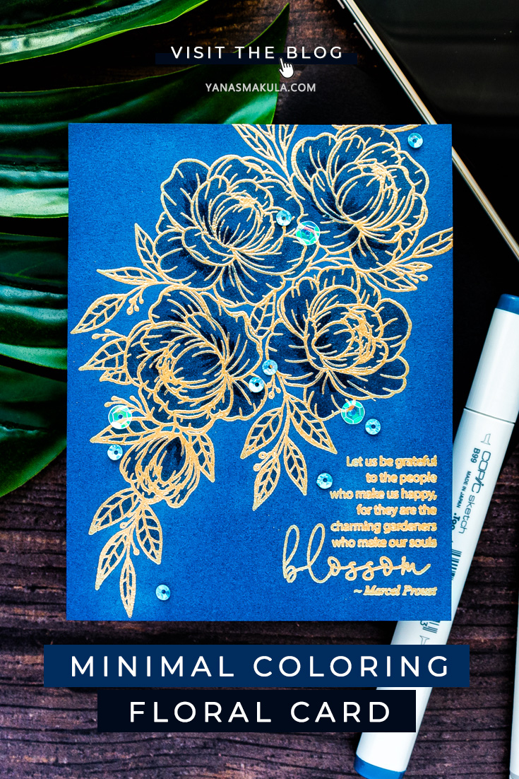 This stamp set features a large floral cluster that easily fills an entire A2 card. Since I wanted to incorporate one of the larger sentiments from this set I positioned the floral cluster cascading from the top edge of the panel. I heat embossed it in Brass embossing powder on dark blue cardstock – I simply love the look of this embossing powder (or gold powder) or dark blue – it’s very classy and always looks stunning.