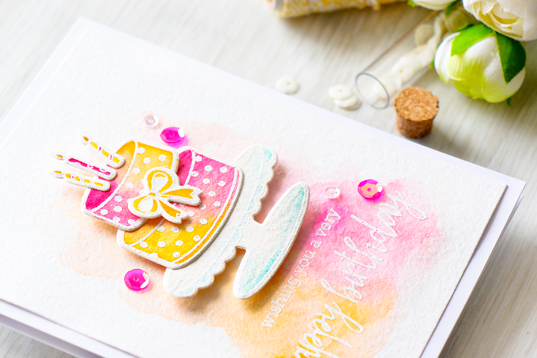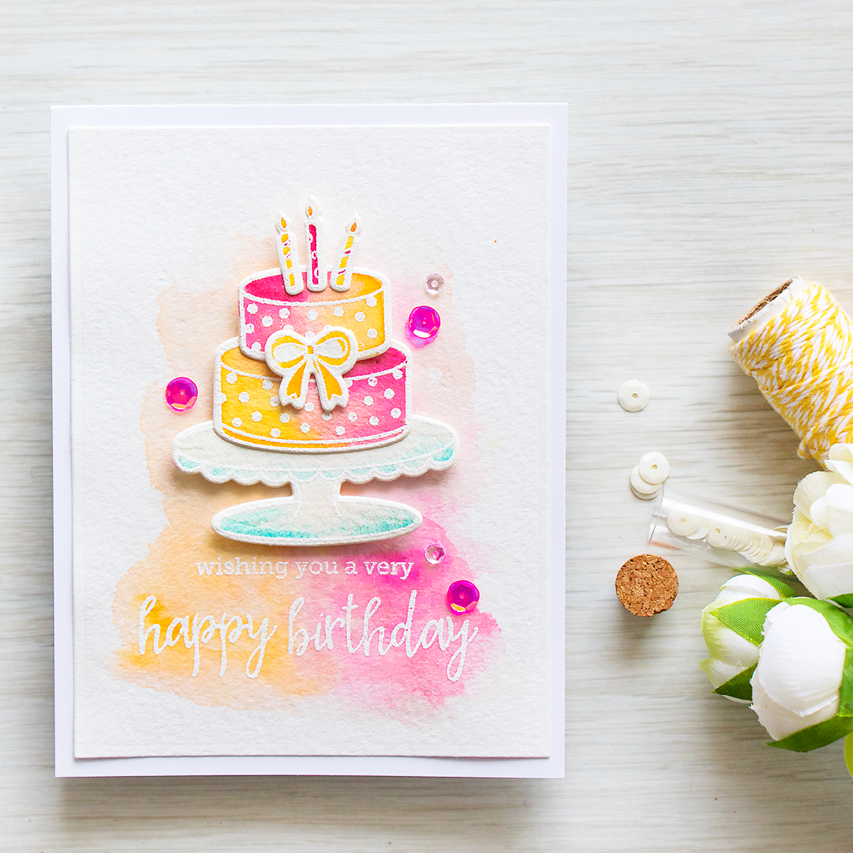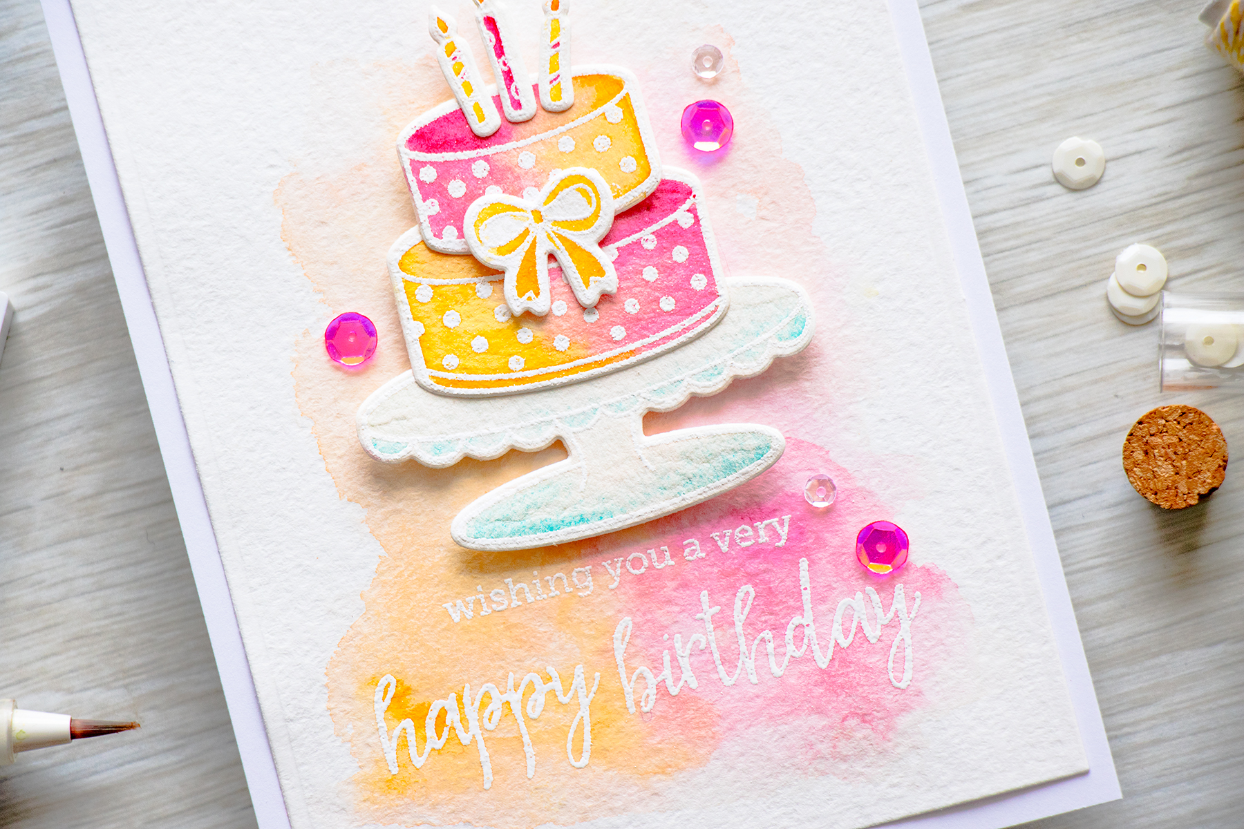 For the background I first heat embossed a Happy Birthday sentiment and then added a soft wash of yellow and pink. My cake was foam mounted onto the background (the layers were adhered using Multi Medium adhesive in matte) and the card was embellished using a few Strawberry Sequins and Clear Droplets from Pretty Pink Posh.