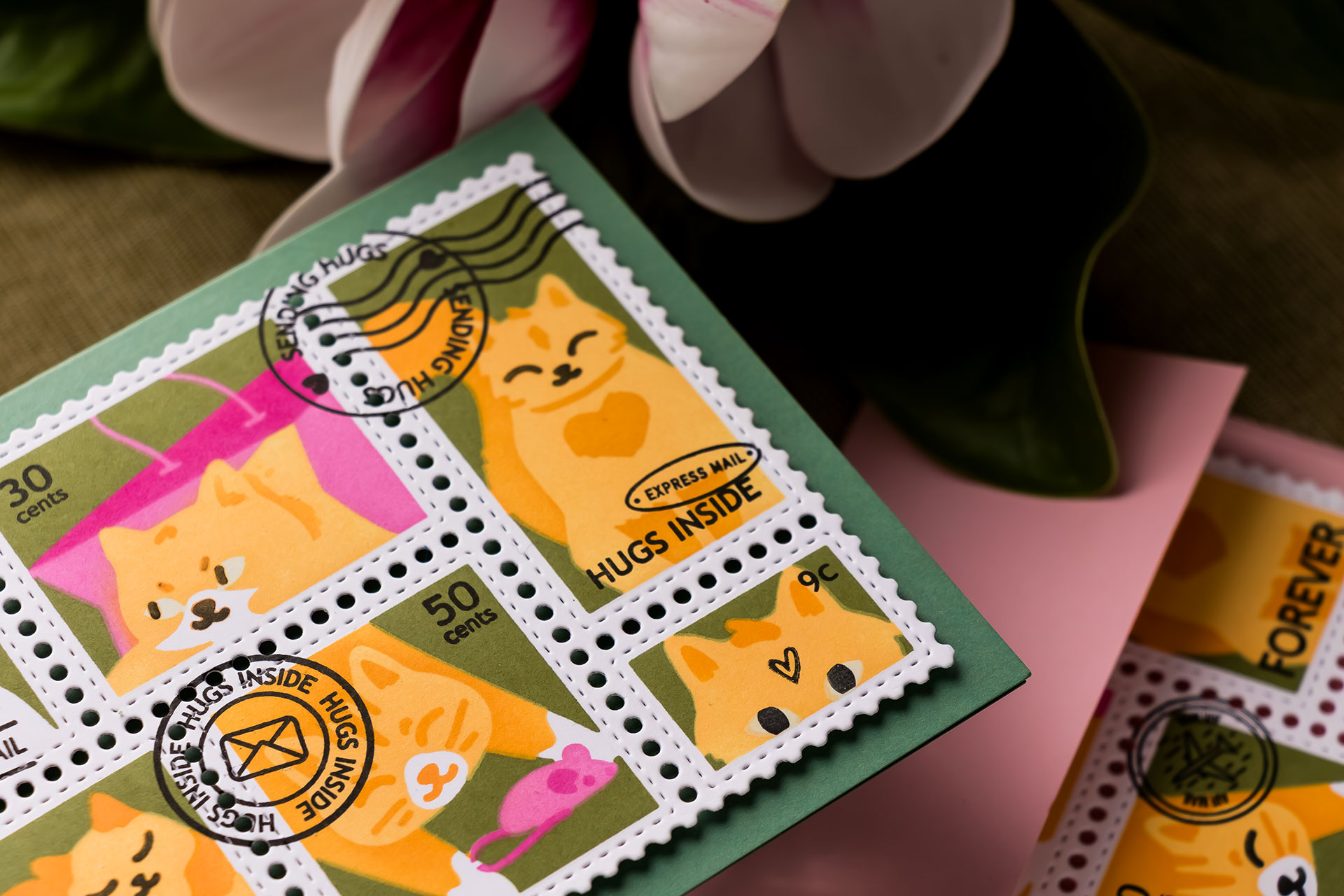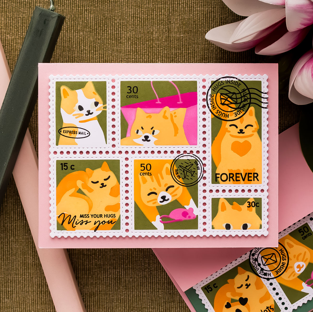 Today I’m sharing several cards featuring the Postage Collage Meow Stencil, the Postage Collage Peony Stencil, the Nesting Postage Collage Peony Stencil, and coordinating goodies from Waffle Flower, paired with my favorite Altenew Fresh Dye Inks.
