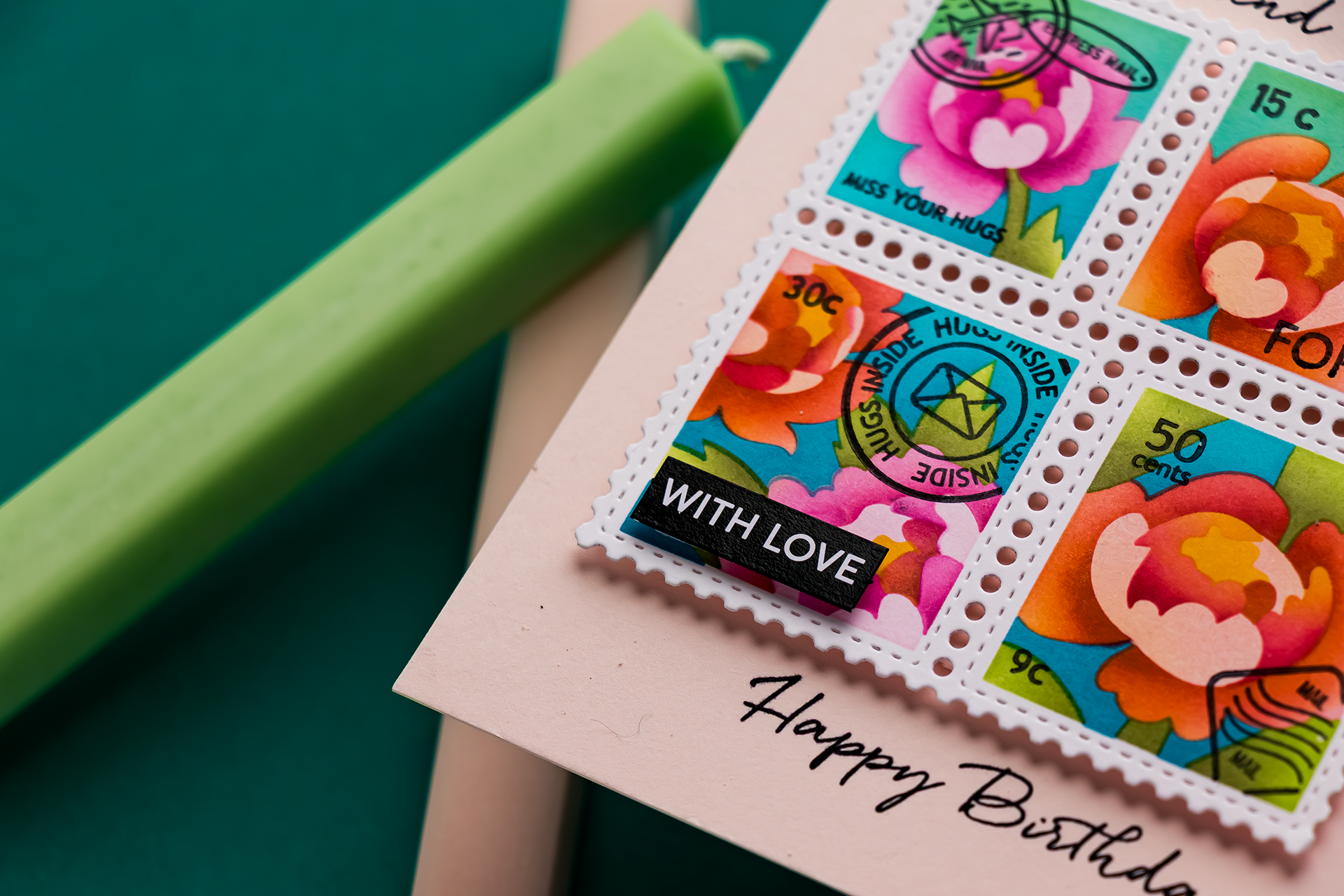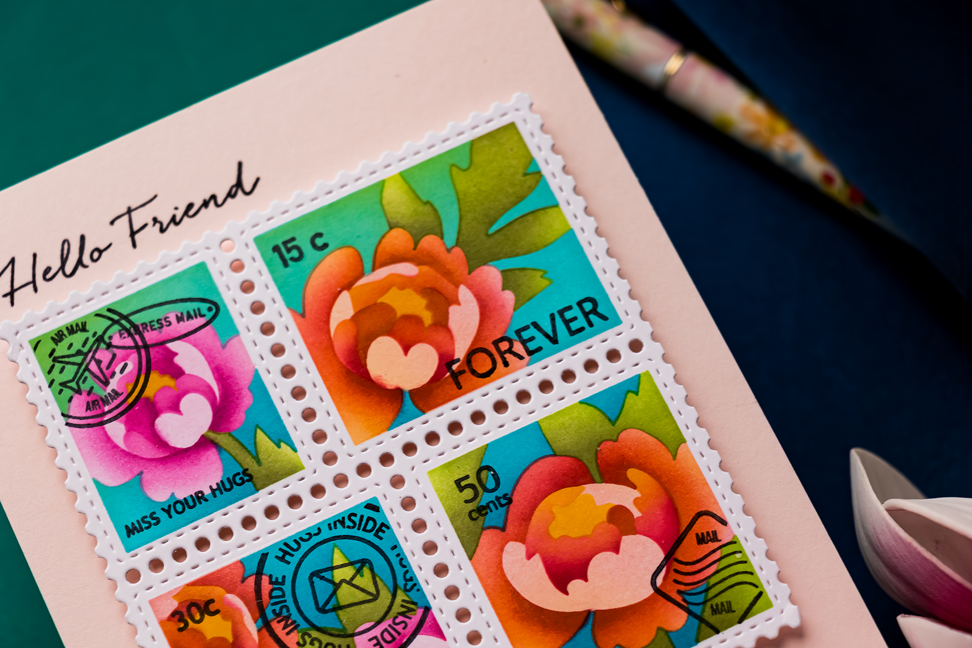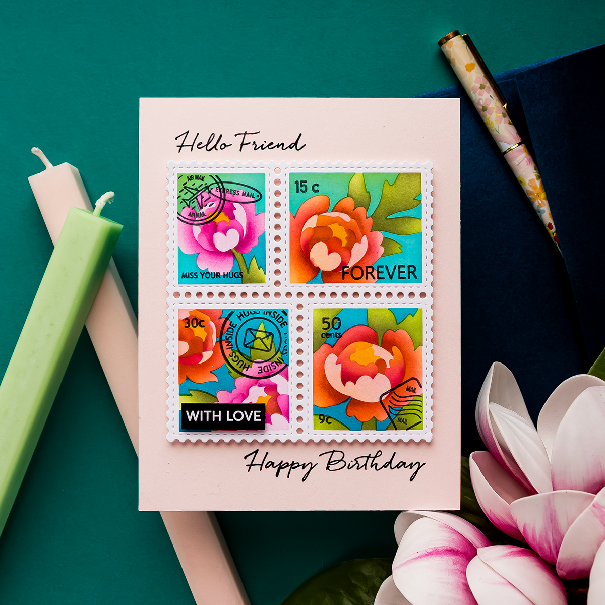 Hi friends, I’m back home from Frankfurt and still riding that creative high. You know that feeling when you’ve had products sitting in your studio for weeks, and suddenly the inspiration hits? That was me with the Waffle Flower Postage Collage collection. I’ve been itching to play with these, and once I started, I couldn’t stop.