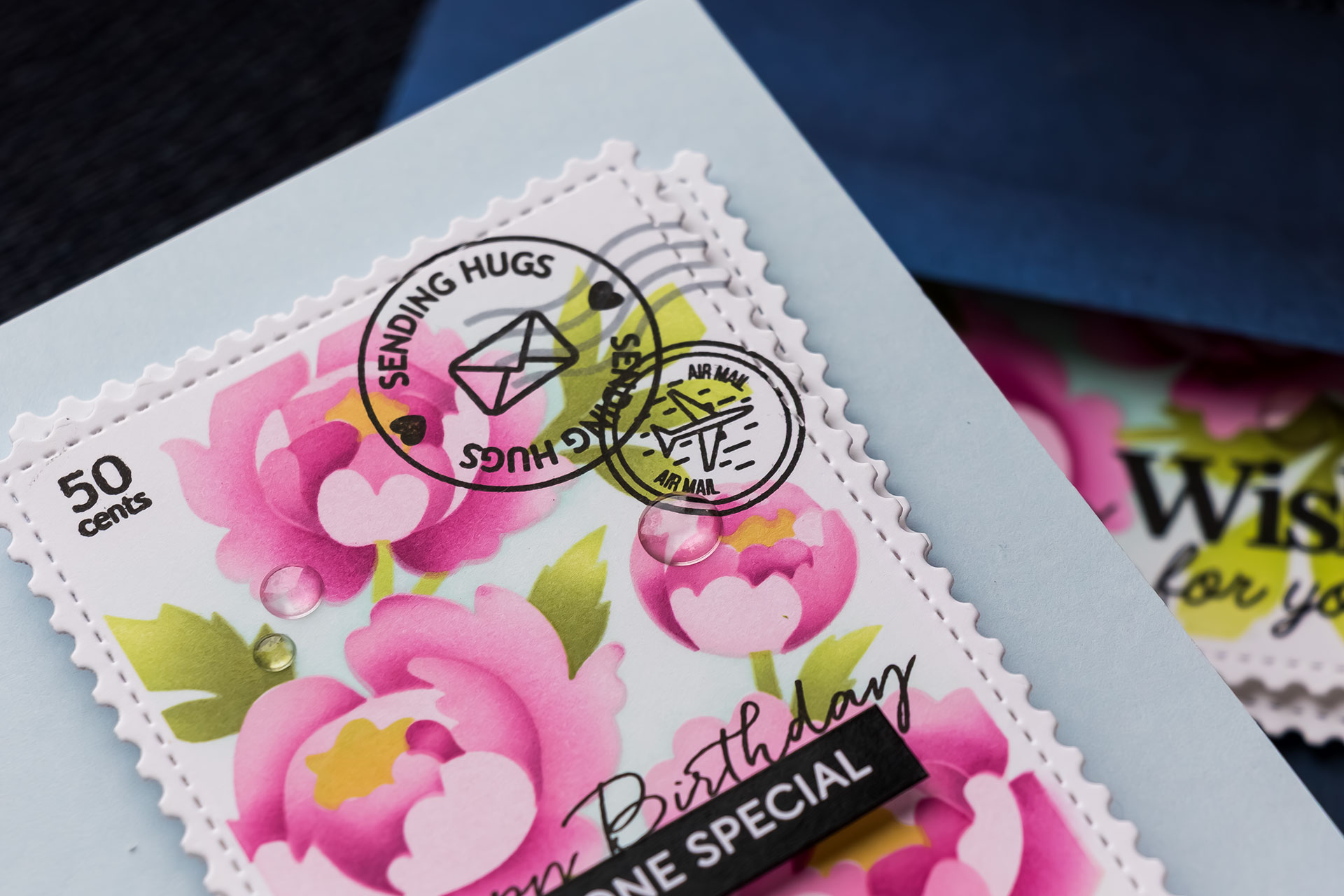 I finished this card with postage cancellation stamping in a softer ink for a more subtle effect, added foam adhesive for dimension, and embellished with clear enamel dots.