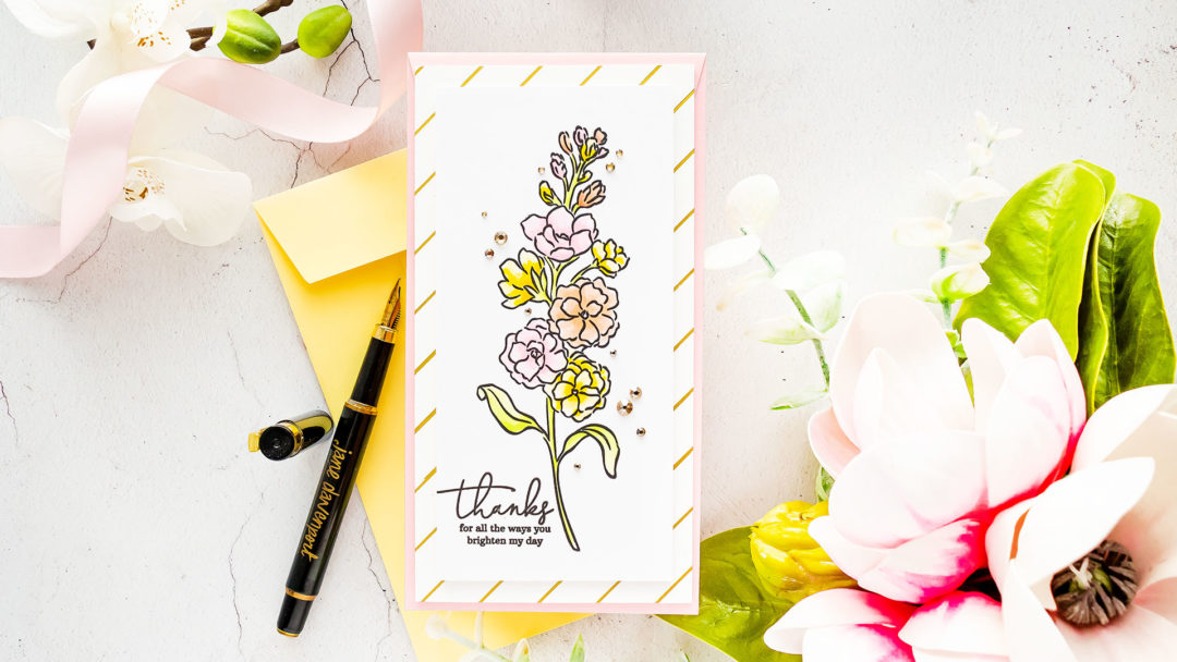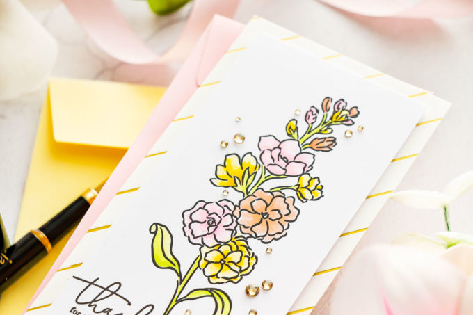 - Stamp Next Level Amazing floral on Simon’s 120 LB cardstock in Memento Tuxedo Black ink. Use mini MISTI.