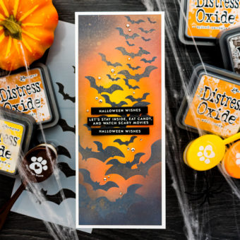 - Trim panel to 2 2/4″ x 5 3/4″. Stamp sentiment in VersaFine Onyx Black ink. Set aside