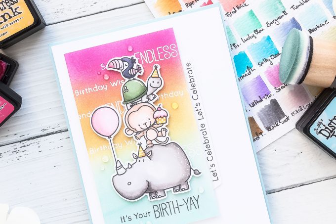 I like to use my white pens to add various details to the colored and regular stamped images. I used size 0.8 Sakura pen and added a few fun dot details on the back of rhino, white horizontal lines the the parry hats and white dots to the cupcake wrapper. Since it’s a party card I felt it was appropriate to add some shimmer details to the balloon and toucan.