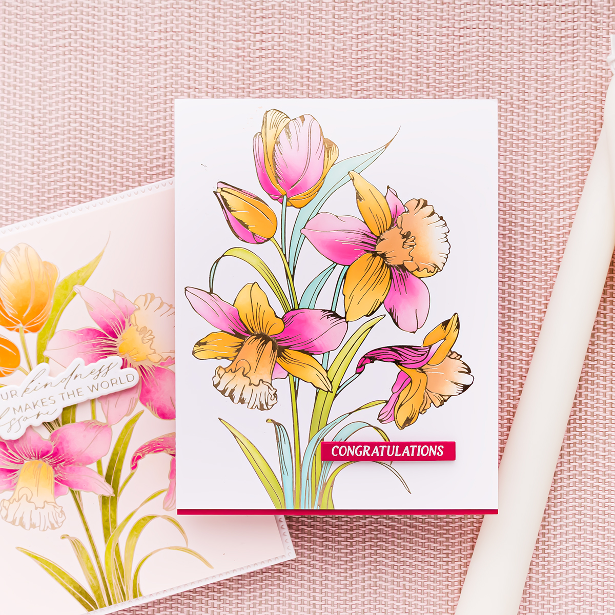For another version, I experimented with colorful windmills. During my December trip, I saw windmills in unexpected shades, including pink and yellow. So of course I had to translate that into a card. Pink windmills paired with pink tulips create a whimsical and coordinated look.