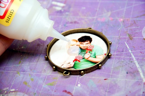 I than adhered my photo inside the bezel and covered it with Dimensional Magic from Mod Podge. I decorated the smaller bezels the same way, but instead of a photo I used pattern paper. Please note, Dimensional Magic takes about 24 hours to dry.