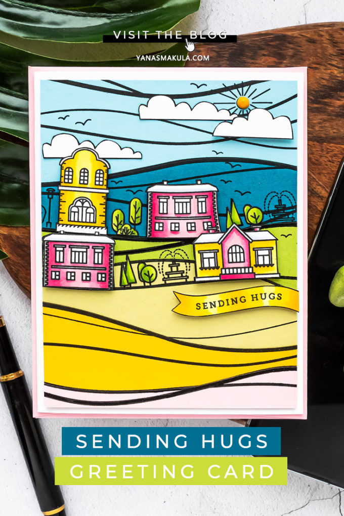 Simon’s Home Sweet Home stamp set is a great one to pair with the Waves background. The stamped houses blend in perfectly with the colorful waves background and the little trees, fountains, and street lamps add to the overall neighborhood appeal.