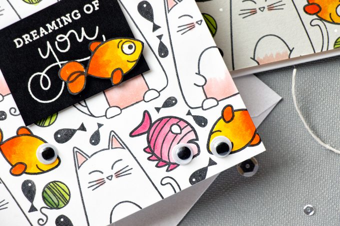 I heat embossed Dreaming of You sentiment in white embossing powder onto black paper; basically the card says that kitties are dreaming about fish. Or if I am the cat and the recipient is the fish I am dreaming about them (I really hope this doesn’t sound creepy or weird, it is meant in the nicest funniest way possible).