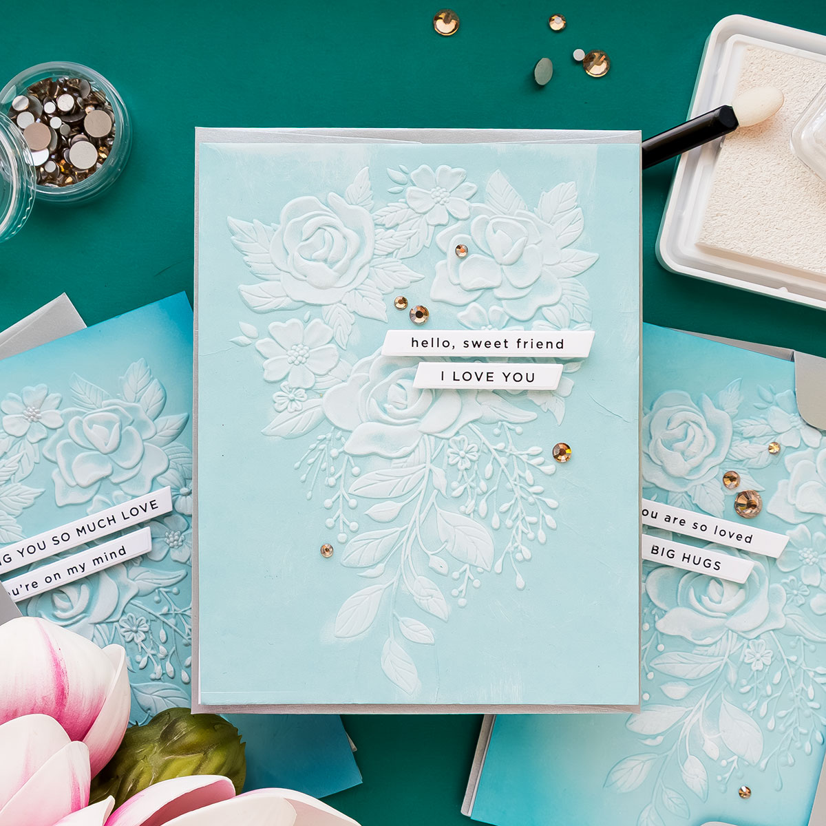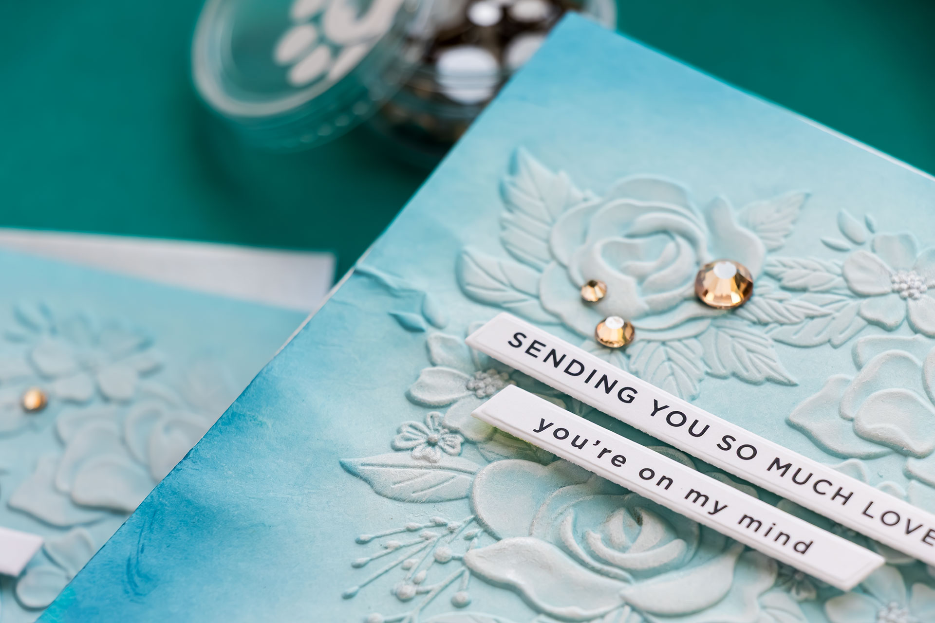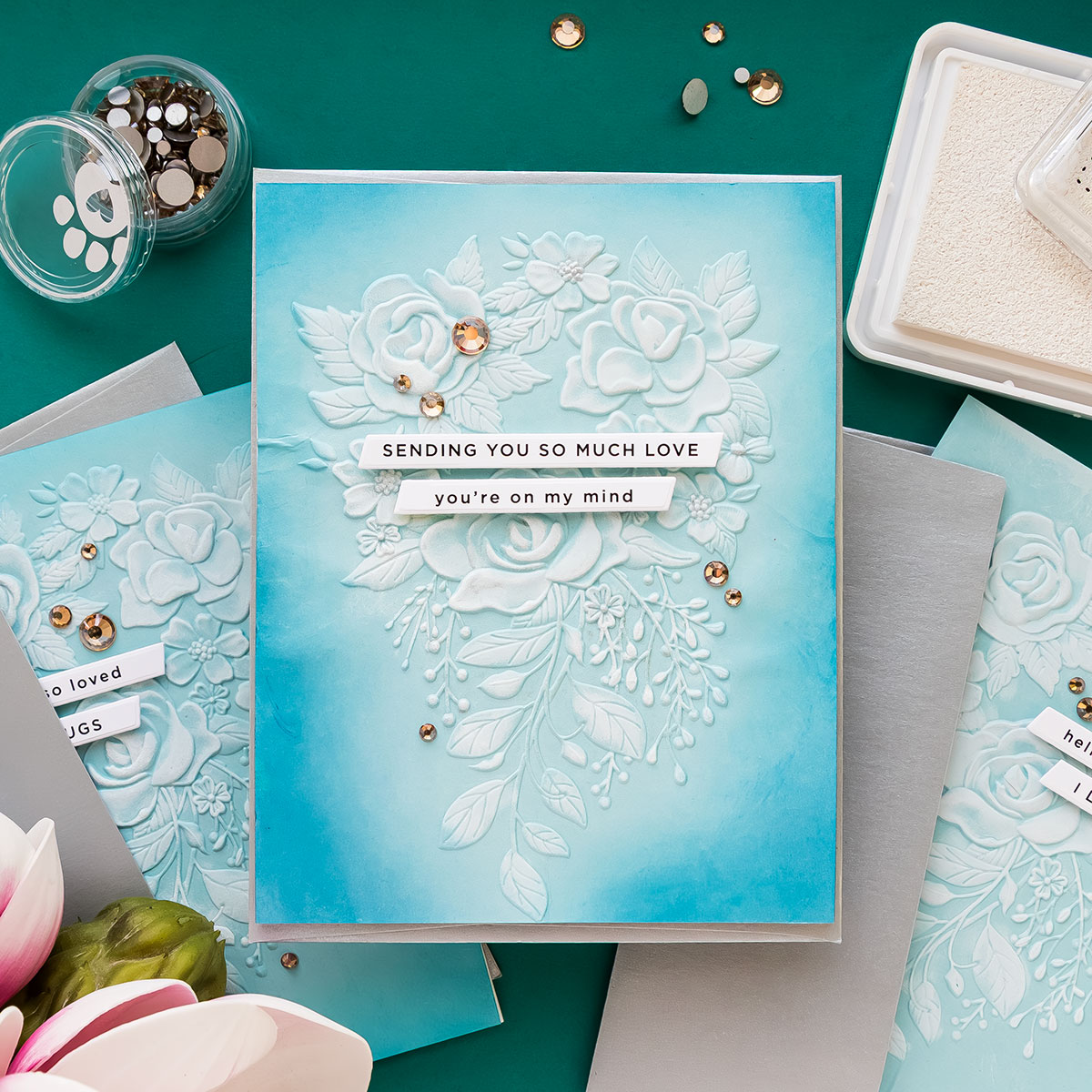 The embossed panels were then adhered to A2 top-folding card bases. Because the cardstock shrinks slightly during embossing, I trimmed the card bases just a bit to ensure everything aligned neatly. A few coordinating gems provide the final finishing touch.