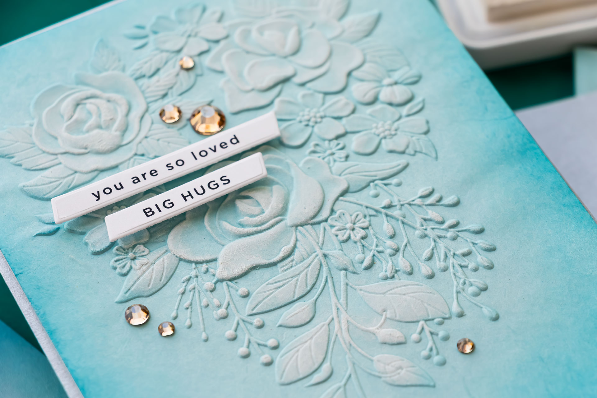 At this point, the embossed panel already makes a beautiful background. You could simply attach it to a card base and add a sentiment for a clean and elegant design. From here, we can also enhance the design with a few additional techniques.