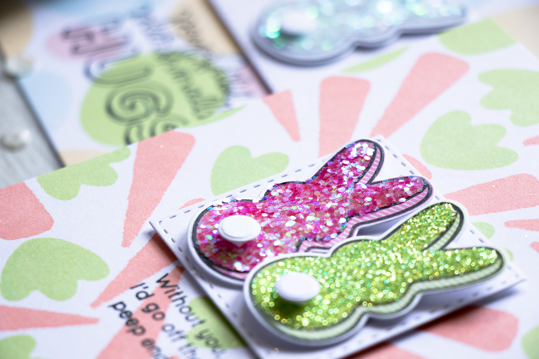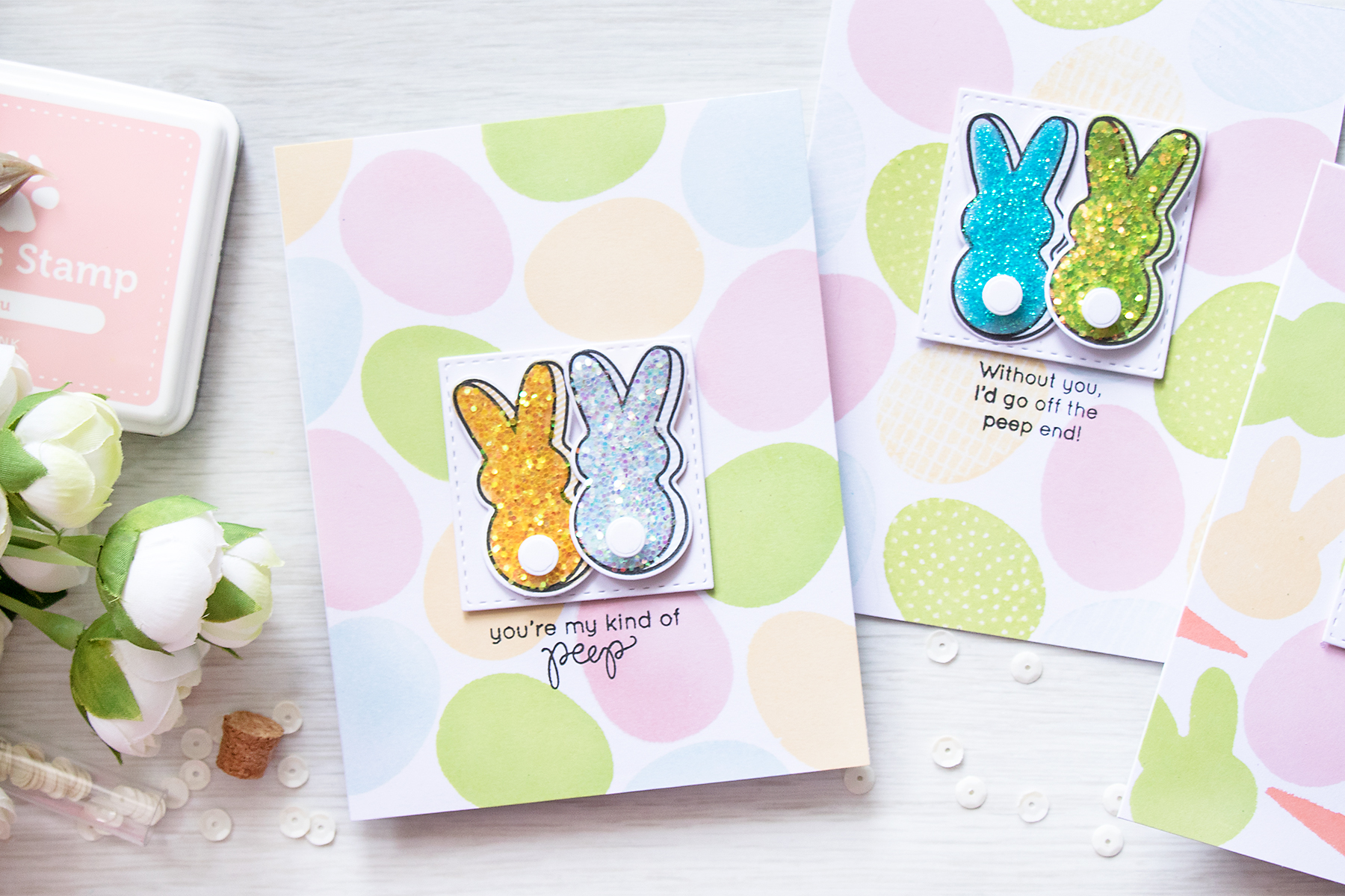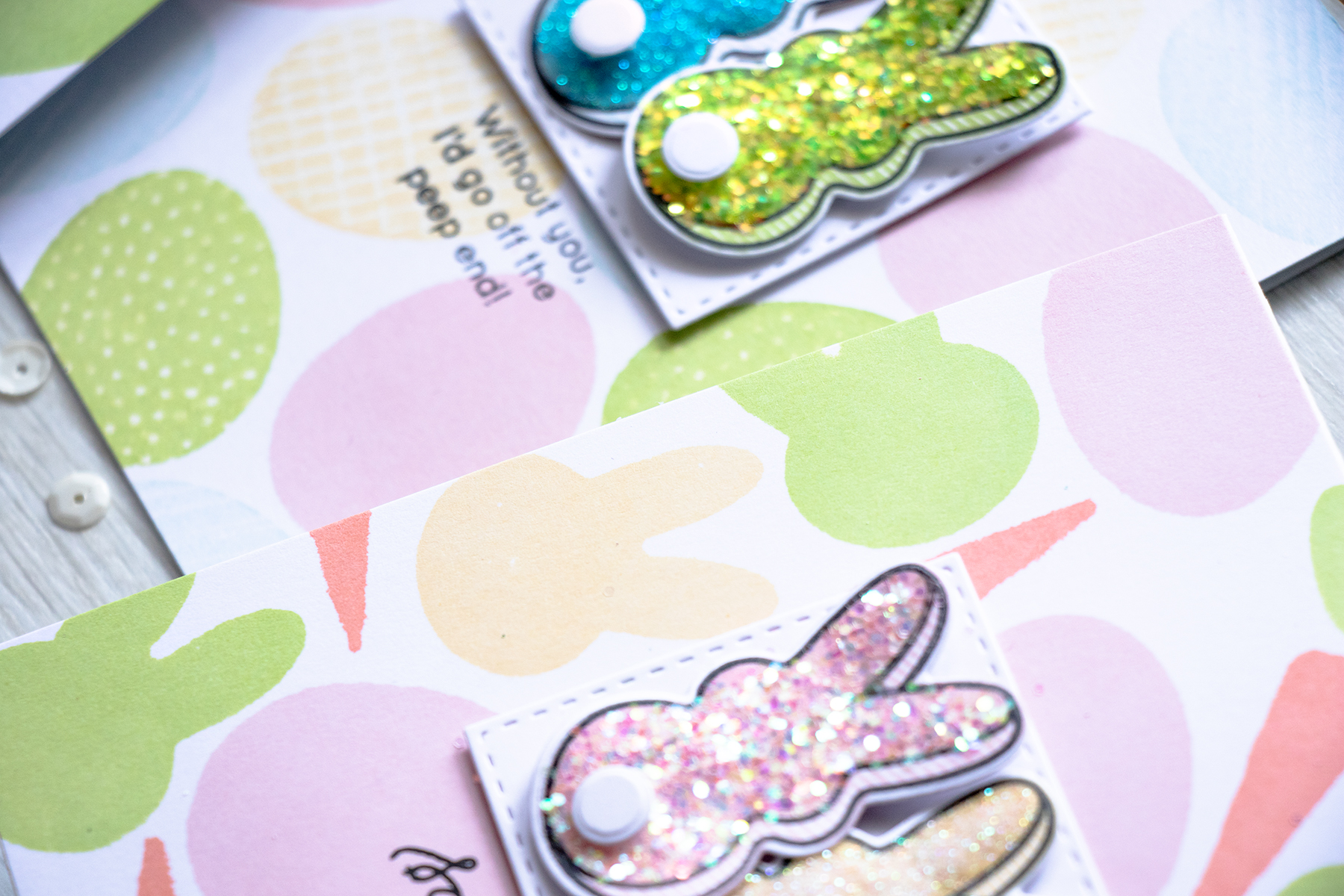 I also used Peep stamps and dies from Simon’s March 2016 Card Kit to create little adorable glittered peeps for my cards. I stamped them using the same colors of ink and covered with Doodlebug Chunky Glitter – love how these turned out! See a few more of these up close below: