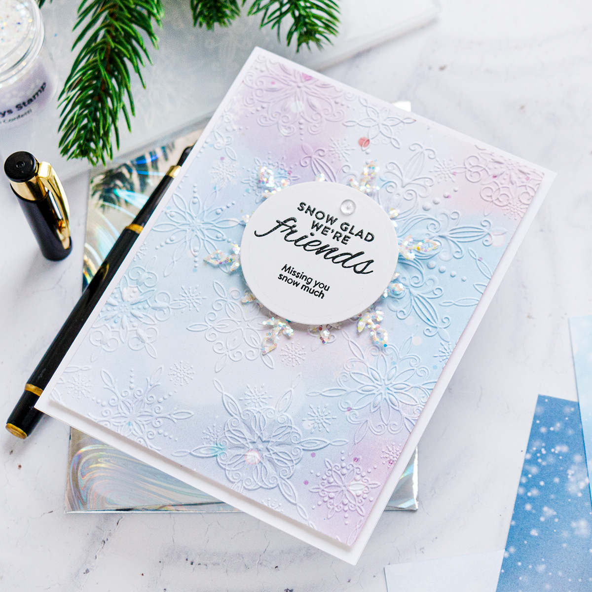 The next project, Snow Glad We’re Friends, is very similar, but I stepped it up a bit. This time I embossed the background patterned paper using the embossing folder included in my kit. It is stunning! I sprayed the paper with water a bit before embossing, this helps the paper fibers to stretch and prevents paper from cracking.