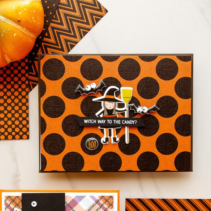 I made this card by simply creating a scene using puffy stickers – I picked a witch, added two bats and a little “Boo” and called it done! I also added tiny googly eyes to make these bats look more silly than scary and a white heat embossed sentiment that reads “Witch Way To The Candy” – love the word play!