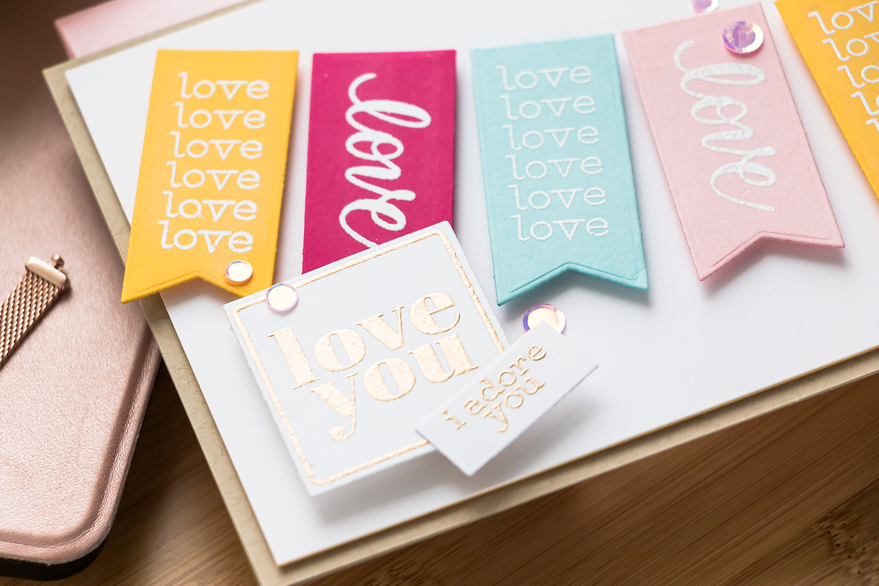 I arranged the little banners/pennants as if they were hanging on a string and adhered in place using foam adhesive. Next, I used a double layer of foam to add “Love You” square and finally used glue to adhere “I Adore You”. Lastly, I embellished this card using sequins from the “Love You” sequin mix.
