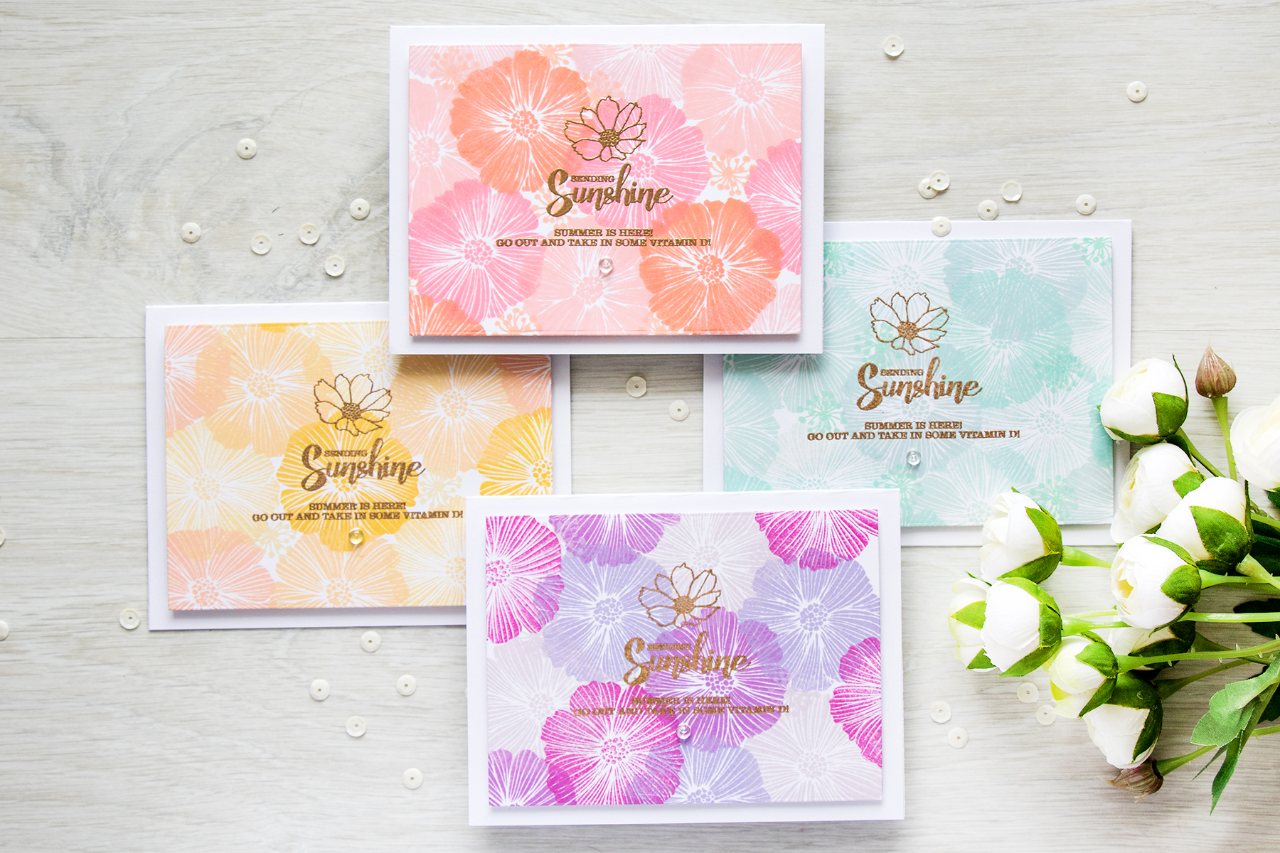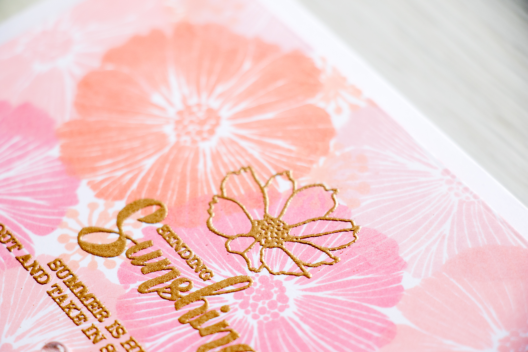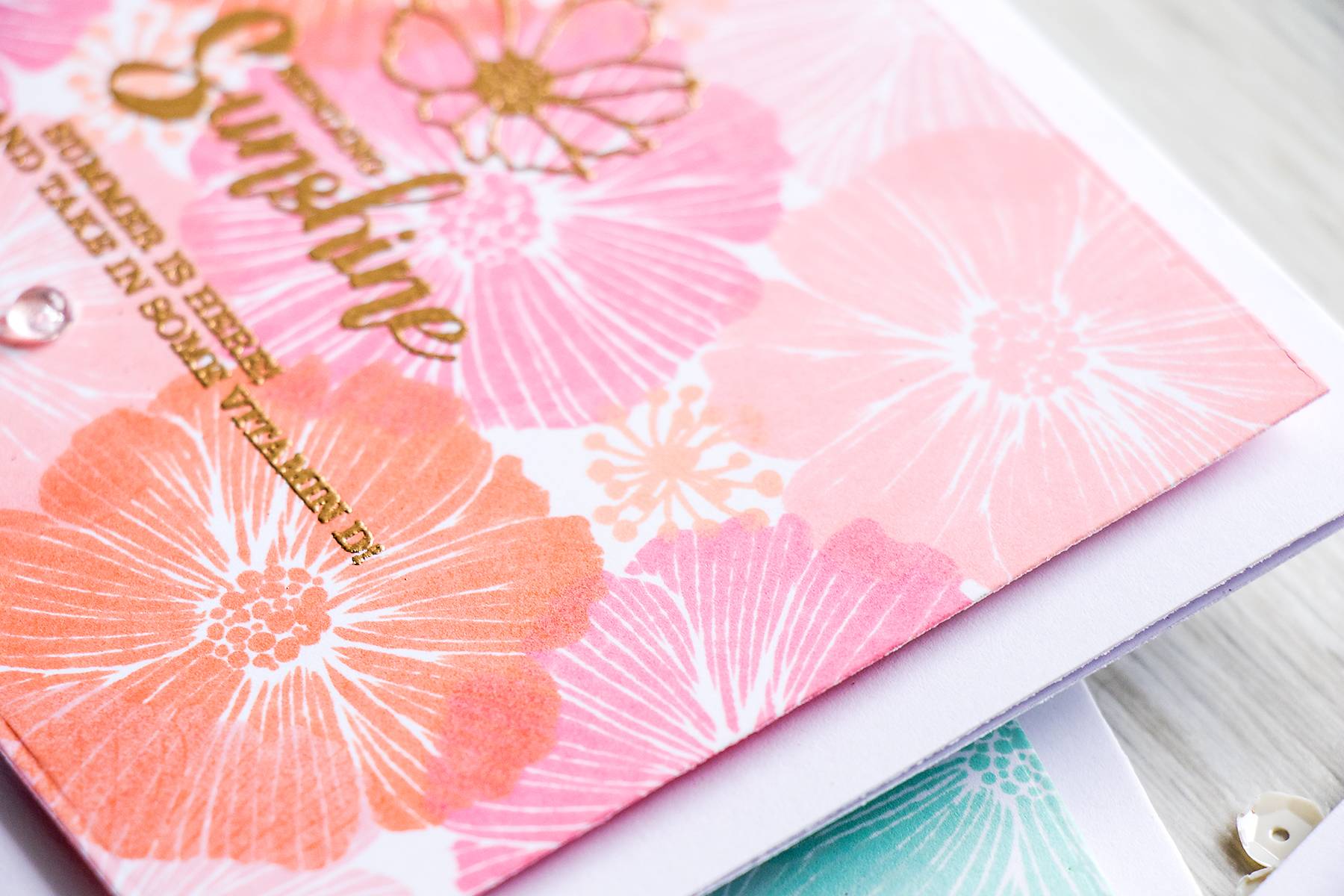 I stamped four patterns in pink, yellow, mint and purple colors. I used at least 4 colors of ink for each pattern + Antique Gold embossing powder to heat emboss the sentiment.