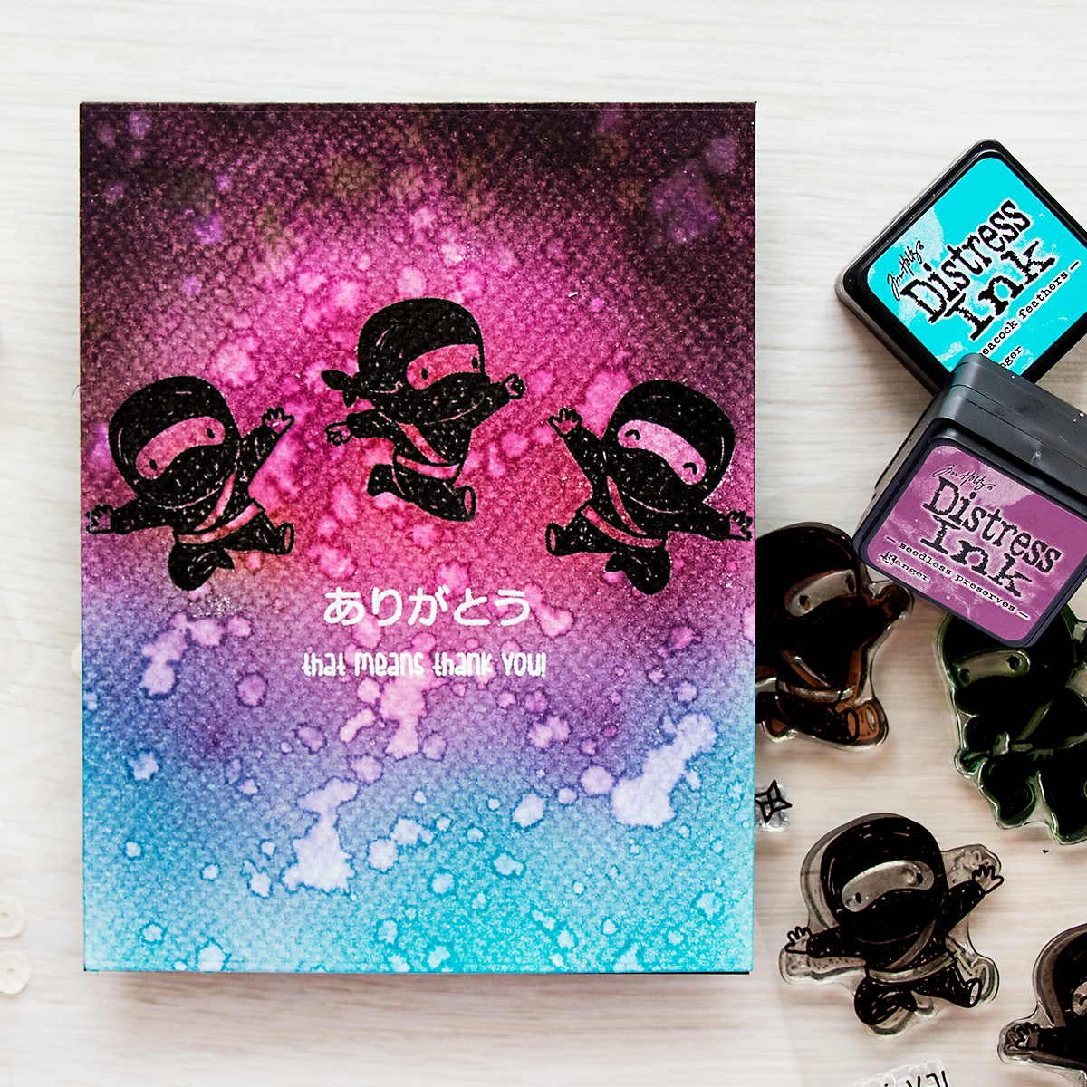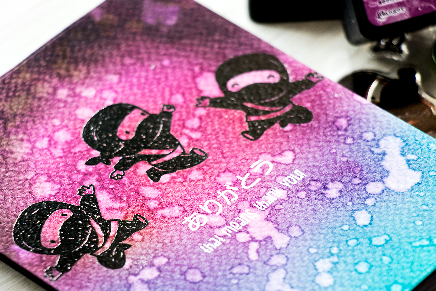 For my second card, That Means Thank You, I first heat embossed ninja images in clear embossing powder over black ink onto Distress Watercolor Cardstock. Next I blended several colors of Distress inks and added water and finally I heat embossed the sentiment in white embossing powder. This is a very simple one layer card.