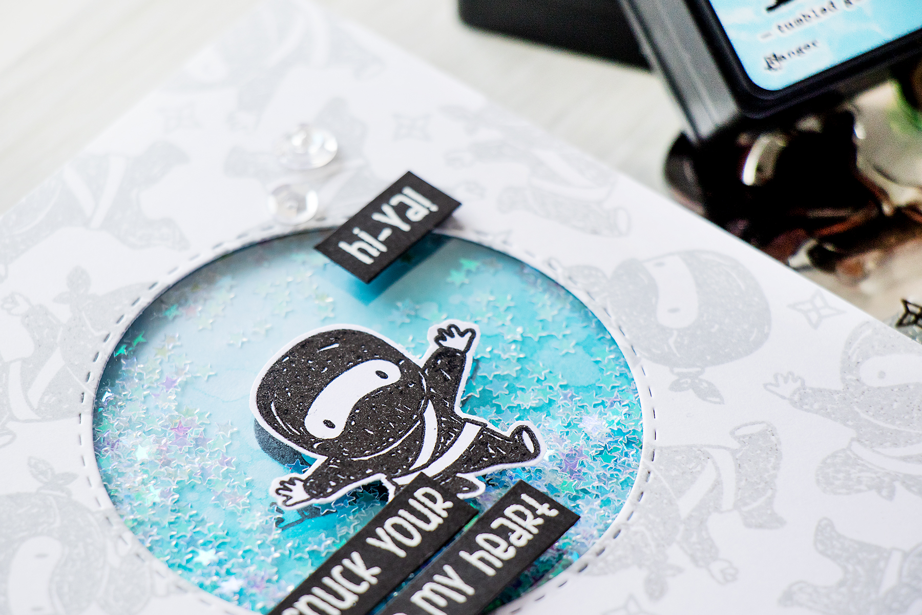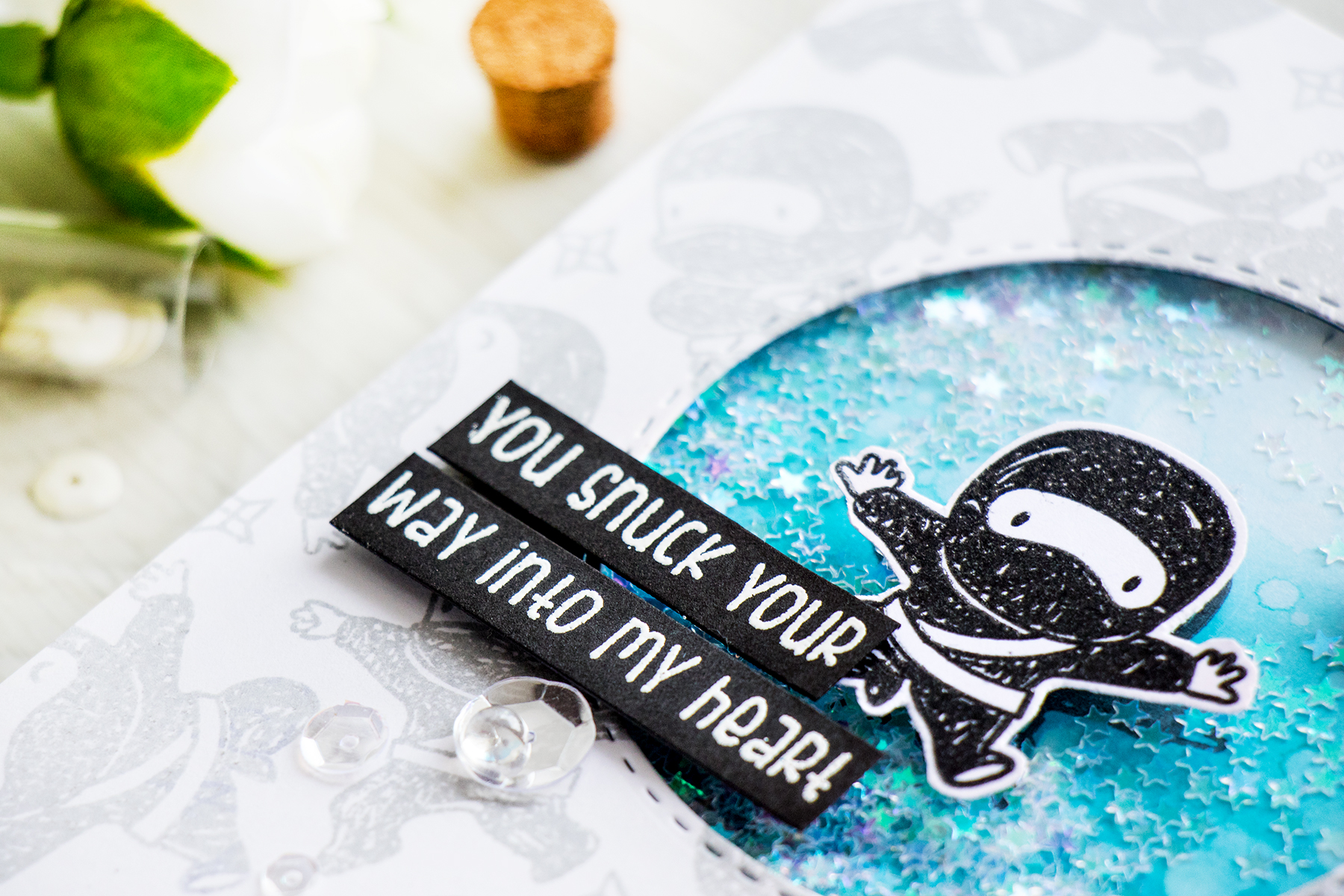 For my first card, You Snuck Your Way Into My Heart I stamped all ninja images in Hero Arts Charcoal Ink. To turn this into an shaker, I die cut an opening in my stamped panel with the help of Simon’s Stitched Circles die, adhered a layer of acetate and foam mounted this over a Distress ink blended background. For the shaker elements I used Pretty Pink Posh clear stars confetti. The sentiment, You Snuck Your Way Into My Heart, was heat embossed in WOW White embossing powder onto black cardstock and was foam mounted onto the panel. I also used clear sequins and droplets to embellish this card.