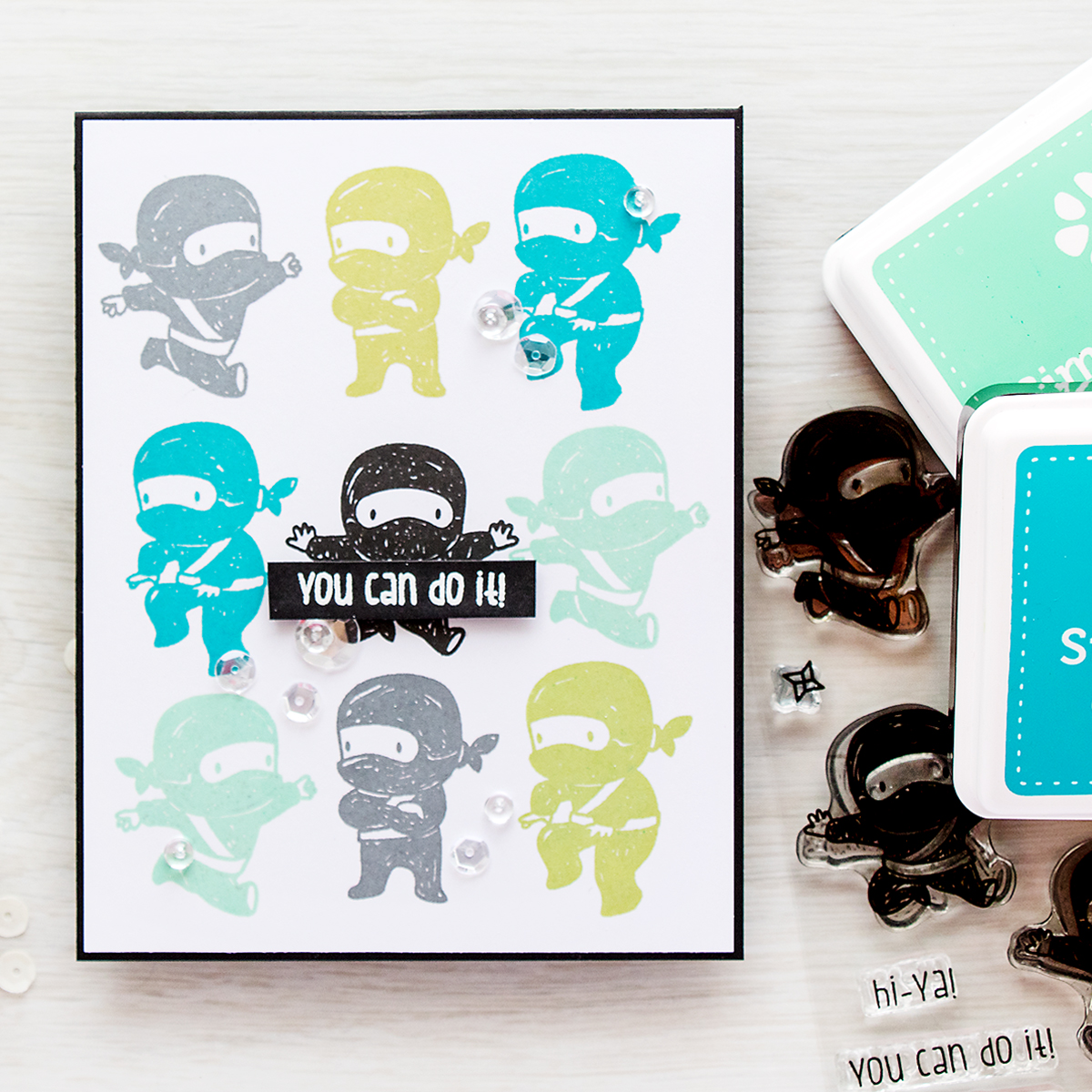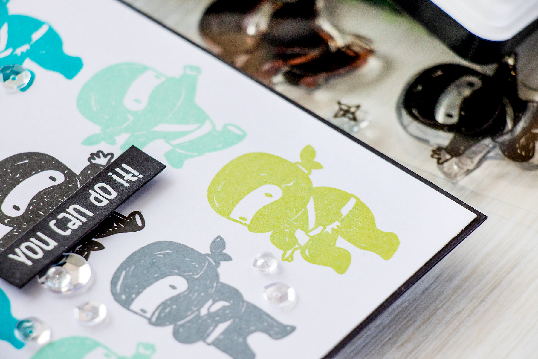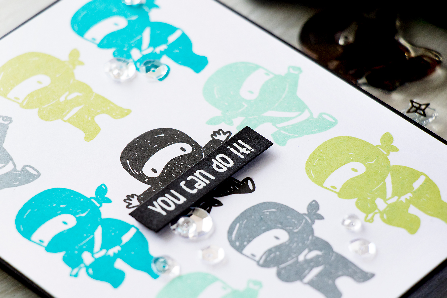 The stamped panel was adhered onto a black card base and the You Can Do It sentiment was foam mounted using black foam tape. Just like with the first ninja card (and many other cards of mine), I used clear sequins and droplets to embellish this card.