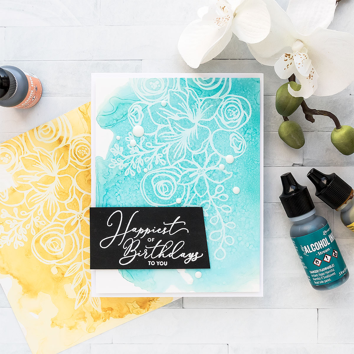 Next, I used my stamp platform and a stamp set from the kit along with a Alcohol Ink Lift ink pad to stamp a beautiful floral cluster and lift the ink off my background. I stamped it several times and blotted ink off with a dry paper towel to reveal this beautiful image on my background. It’s like an emboss resist technique without the embossing or resisting. Very beautiful results, and frankly – not hard to achieve at all.