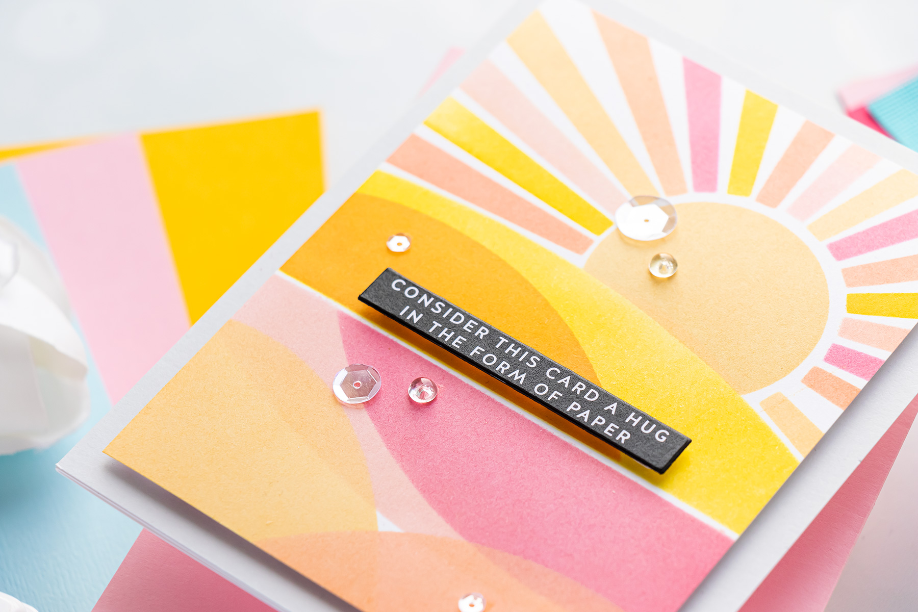 I used Simon’s Slimline Scene Builder stencil and ink blended the background for my card. It was so fun! The combination of yellow, peach and pink is very inspiring, but also calm.