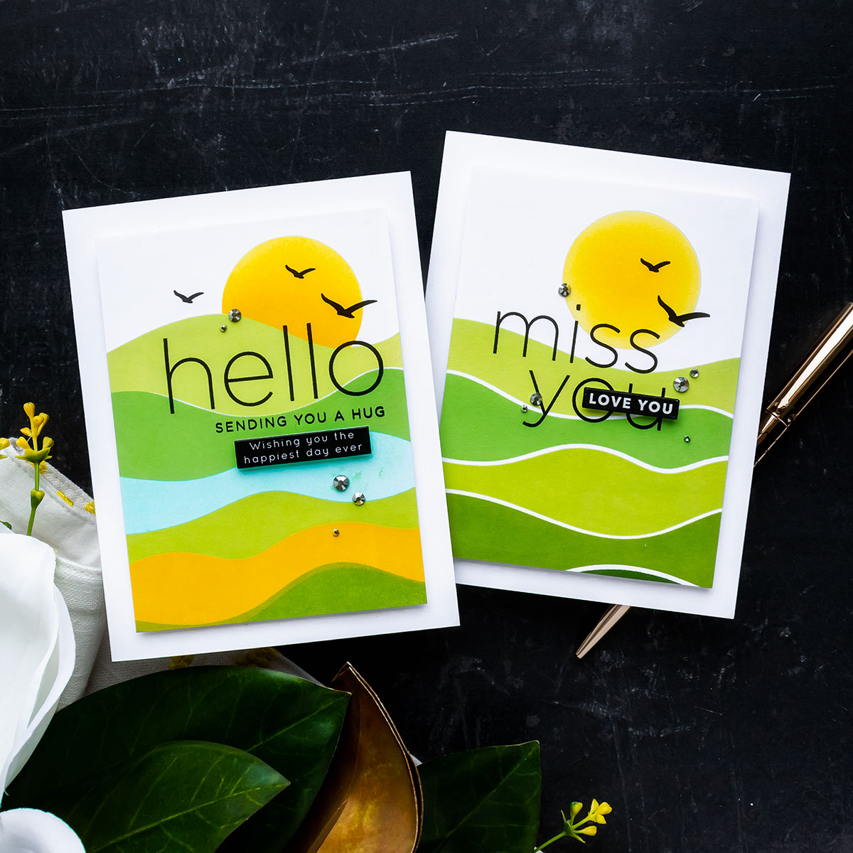 If you want, you can also add some subtle stamping to the background. I love to stamp birds flying in the sky, especially overlapping the sun. You can also stamp clouds and other elements. I foam mounted the panels onto A2 white side folding card bases and finished my cards by adding a few silver gems.