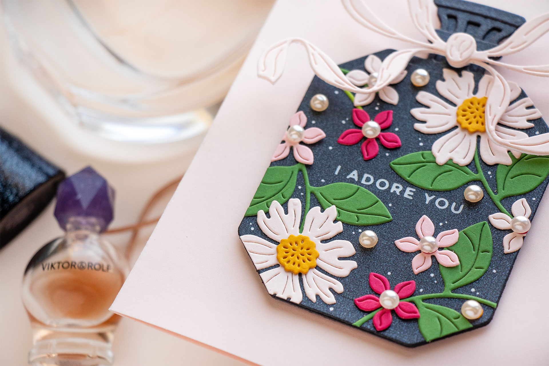 Then came the fun part—florals! I used the Gorgeous You Florals die set to create a frame of flowers around the bottle, drawing inspiration from classic perfume ads where bottles are surrounded by blooms.