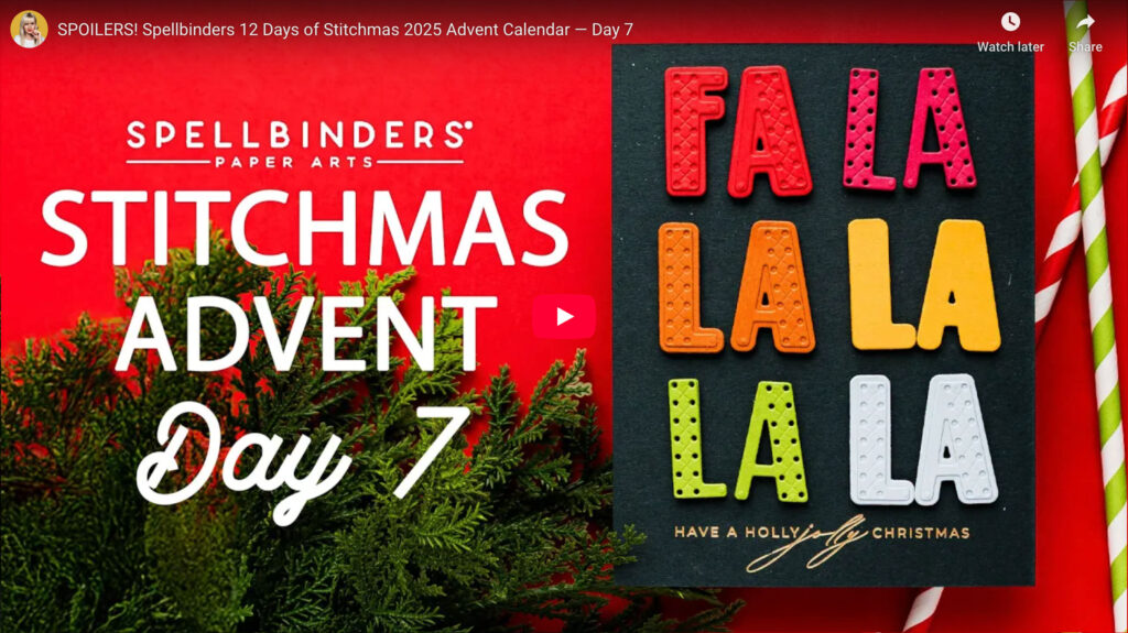 Welcome back to the 12 Days of Stitchmas Advent Calendar by Spellbinders. Day 7 reveals a modular “Fa La La” sentiment set designed for color play, stacking, and subtle stitch-style detail. I created a bold, multicolor layout over a deep green card base and finished it with a small foiled sub-sentiment. Love it!