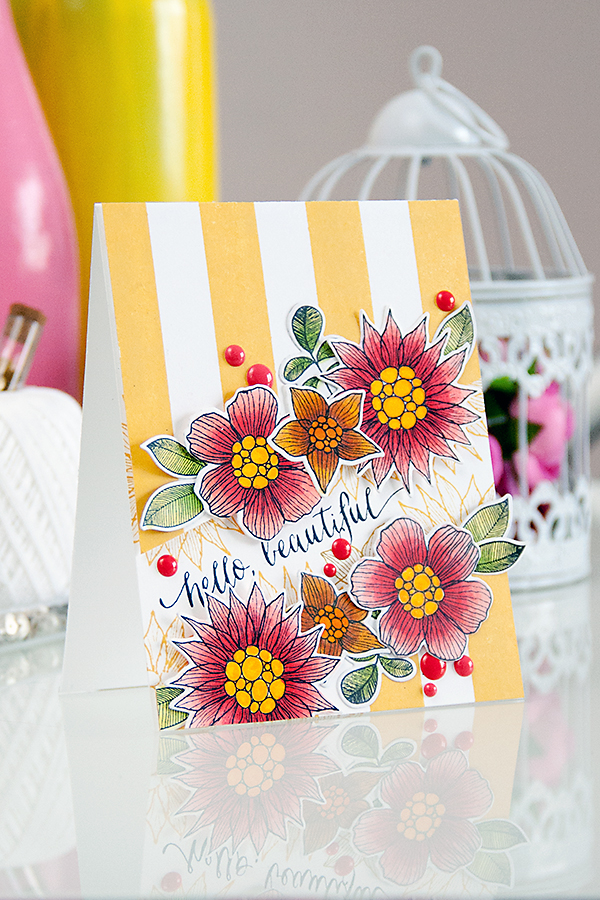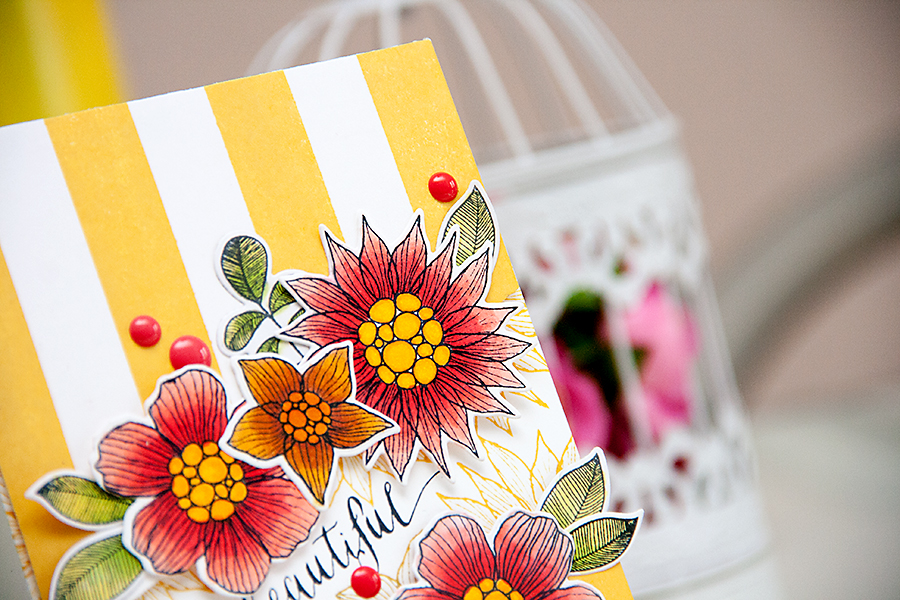 I used two stamps for my project today – a Wide Stripe background cling stamp and Summer Garden clear set along with matching dies. The background stamp is 6×6 inches, so it can be used either vertically or horizontally which makes it really versatile. I’ve used it a few times already and I really like how well it stamps on a card. Here are a few horizontal examples: