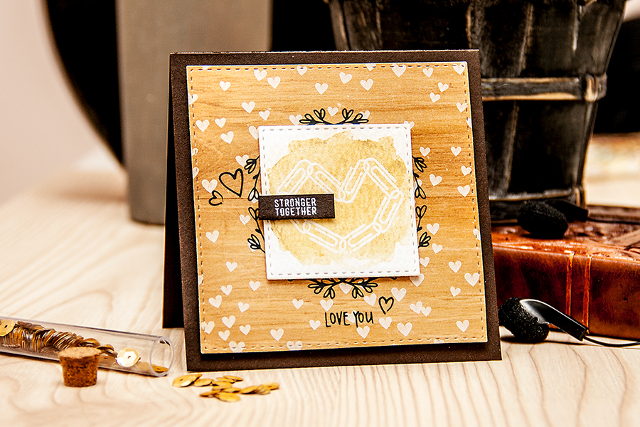 Now this card features several simple techniques – there’s emboss resist and watercolor using gelatos. The adorable paper clip heart in the center of my card was heat embossed onto Tim Holtz watercolor paper using clear embossing powder. Watercolored look was achieved using gold gelato + a bit of water.