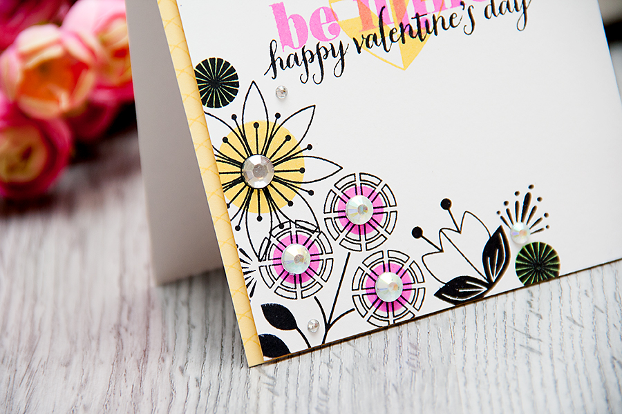 Here are the three cards that I made, you can see I went with a very bold color combo this time – black + yellow + neon pink + a pop of green. Very unusual for Love-themed cards, but I just love how they turned out, especially the one in the middle!